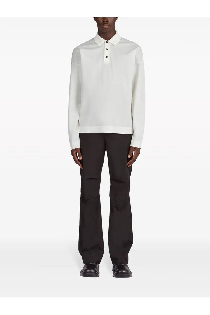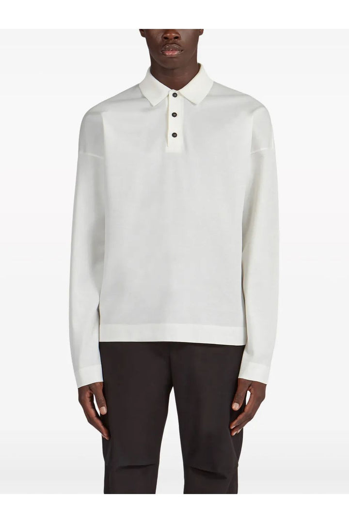 '- off-white - cotton - piqué weave - polo collar - front button placket - long sleeves - straight hem