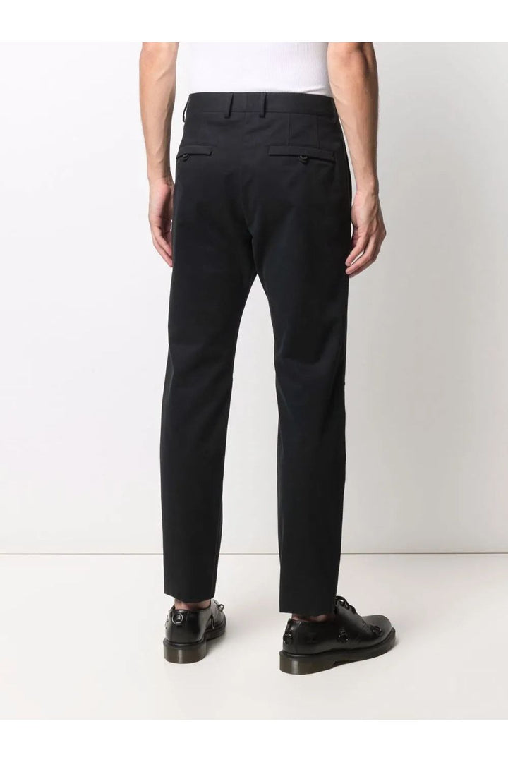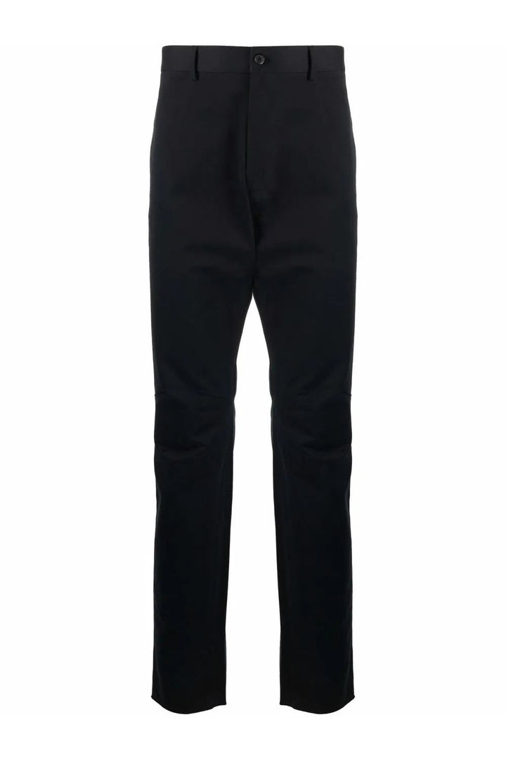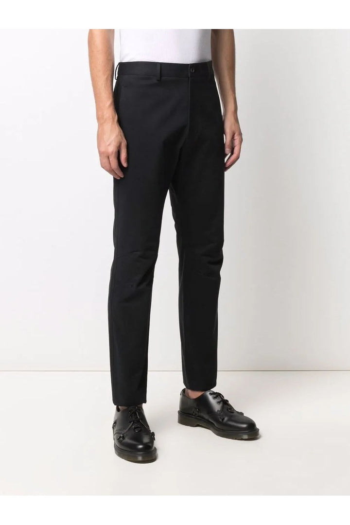 '- jet-black - cotton - slim cut - front button fastening - two diagonal pockets to the sides - two rear welt pockets