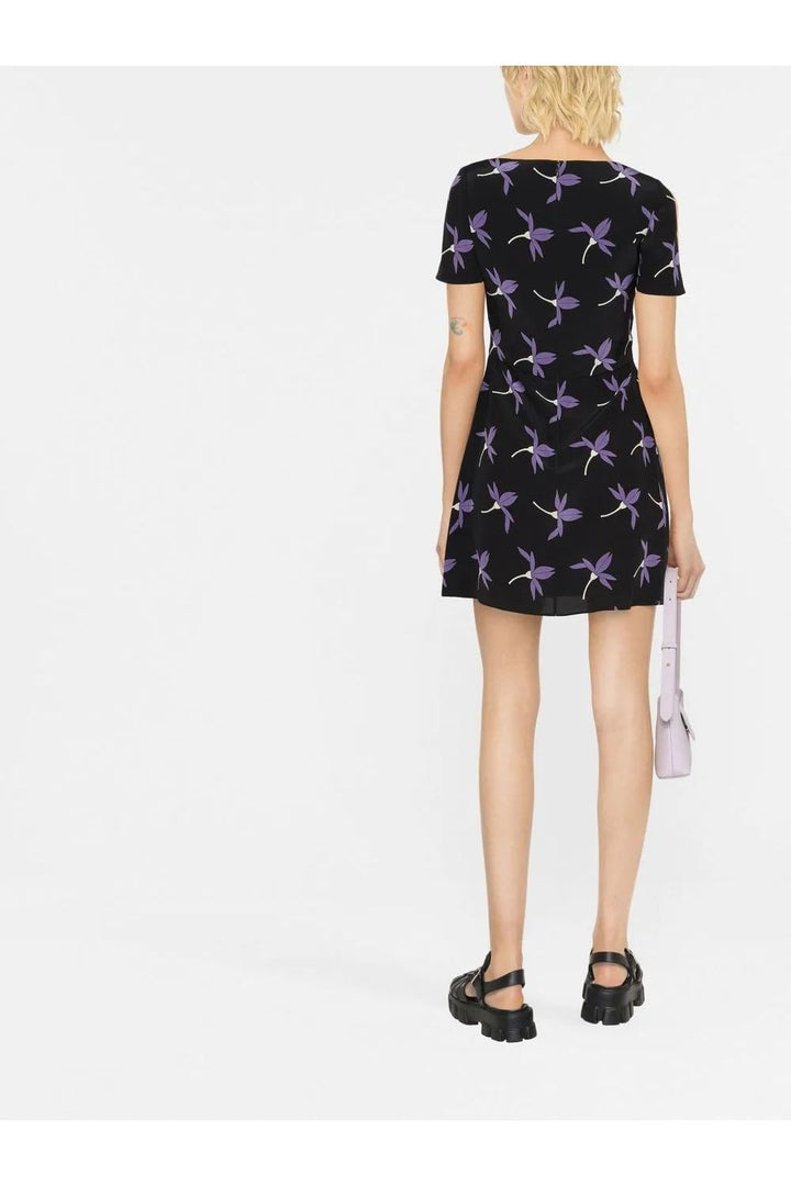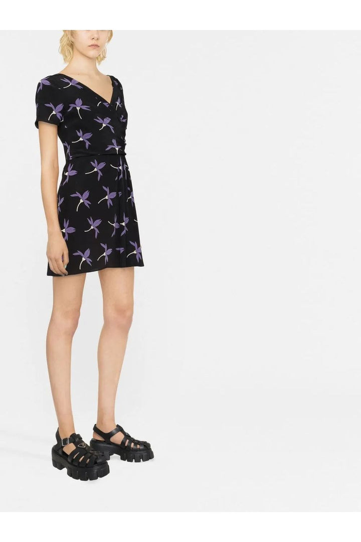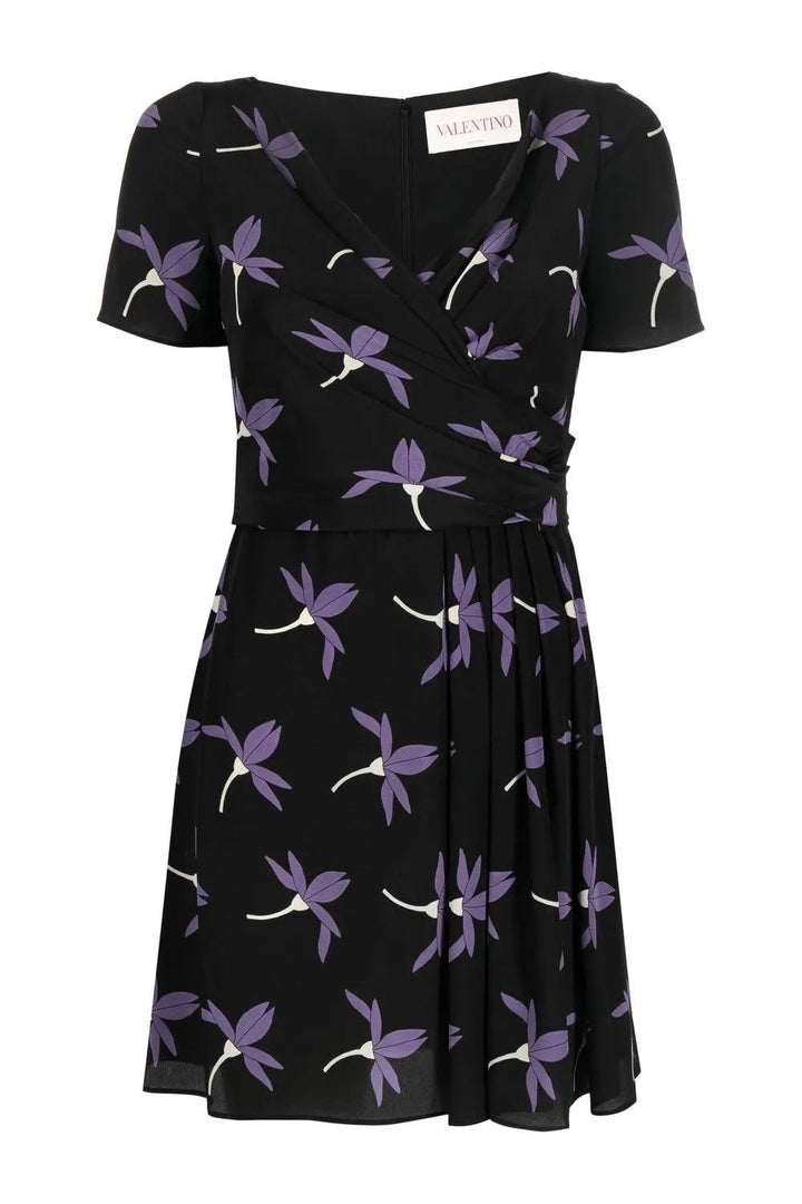 '- Valentino Ready To Wear - black/violet/white - stretch-silk - all-over floral print - fully pleated - crossover neck - short sleeves - A-line skirt