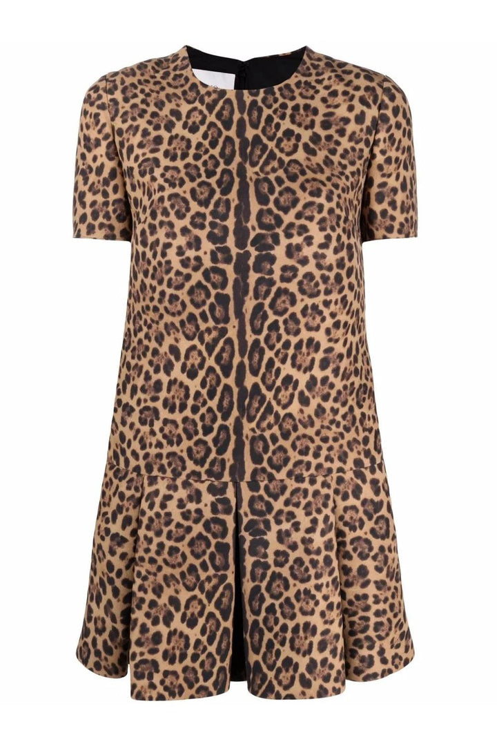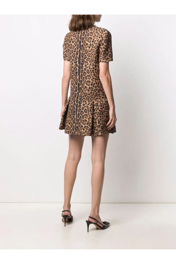 '- Valentino Ready To Wear - brown/black - virgin wool-silk blend - all-over leopard print - box-pleat detail - round neck - short sleeves - concealed rear zip fastening