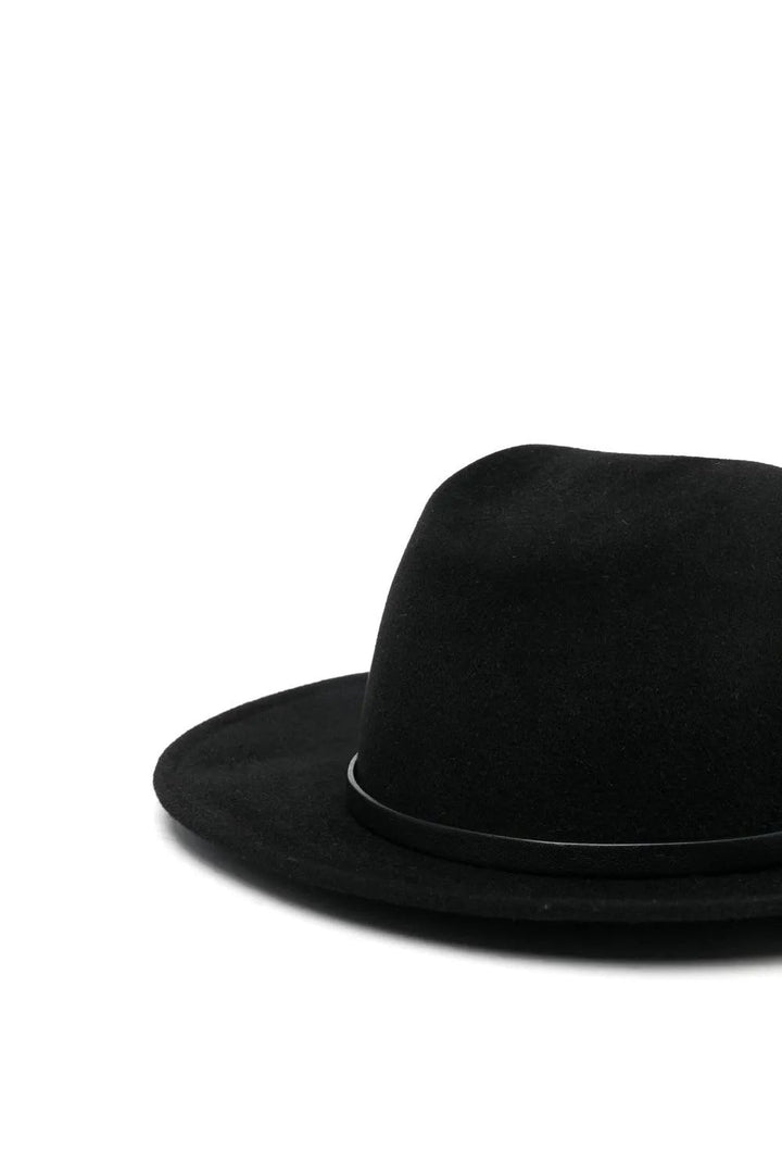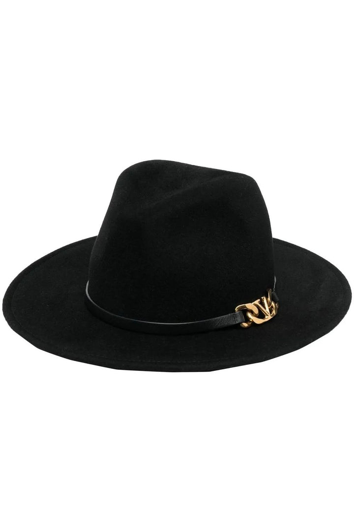black gold tone logo plaque strap detail at the crown centre dent crown wide brim