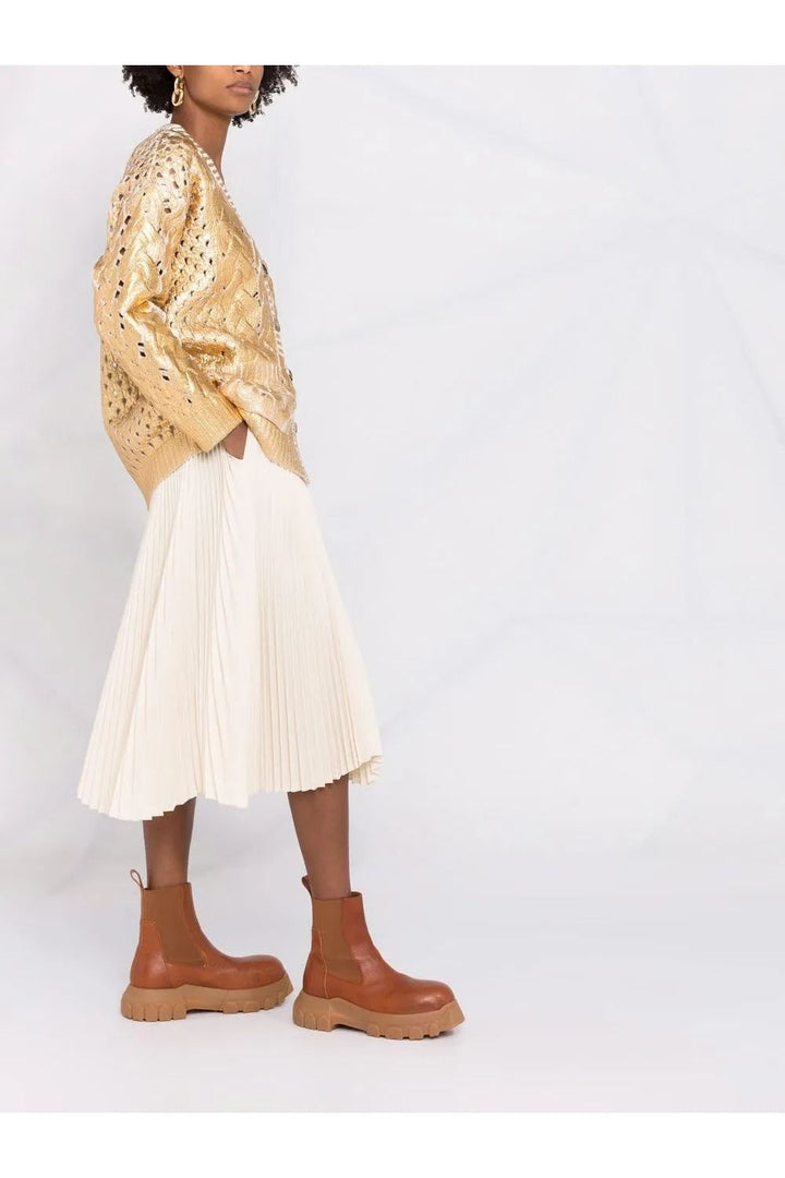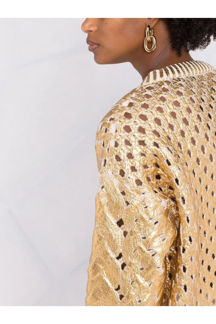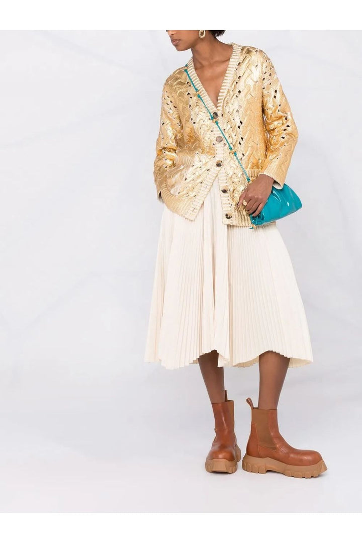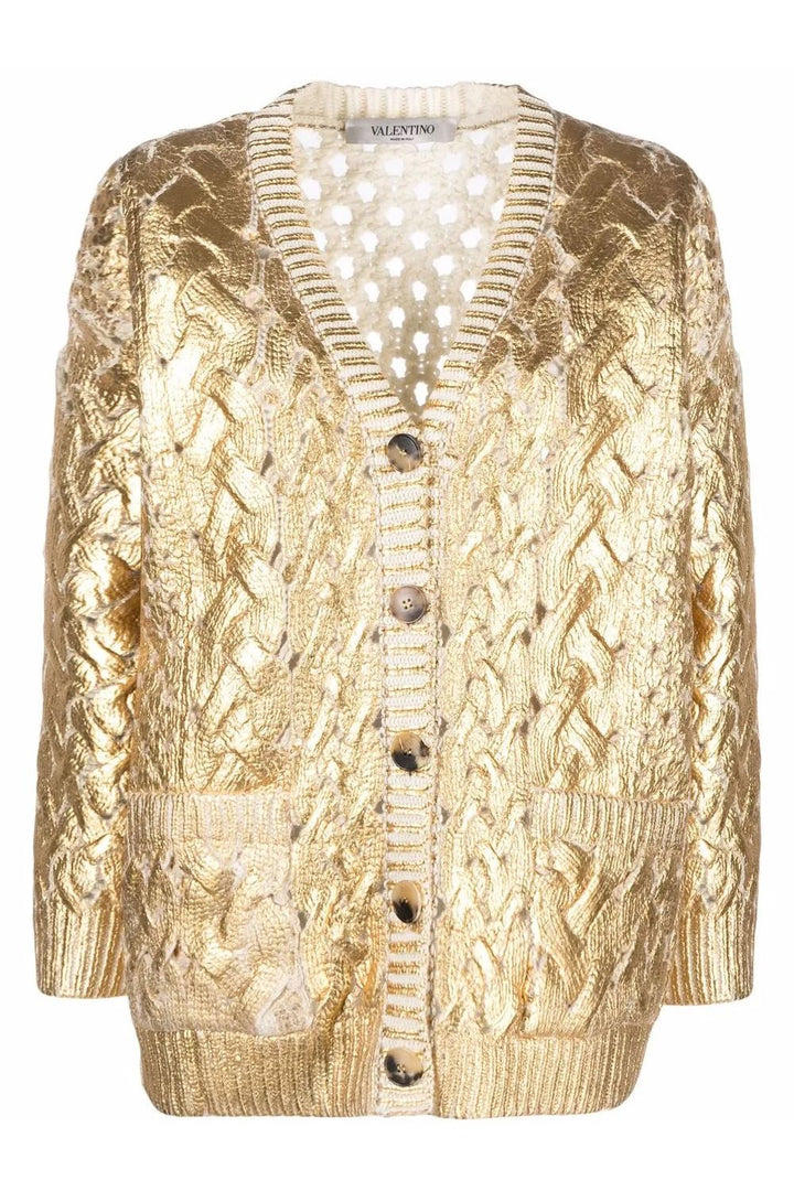 '- Valentino Ready To Wear - gold-tone - virgin wool - V-neck - front button fastening - long sleeves - ribbed cuffs - ribbed hem - two front patch pockets - metallic effect