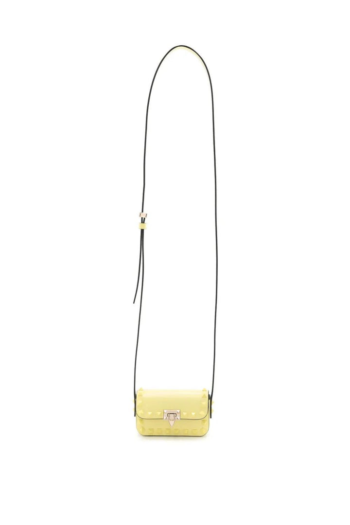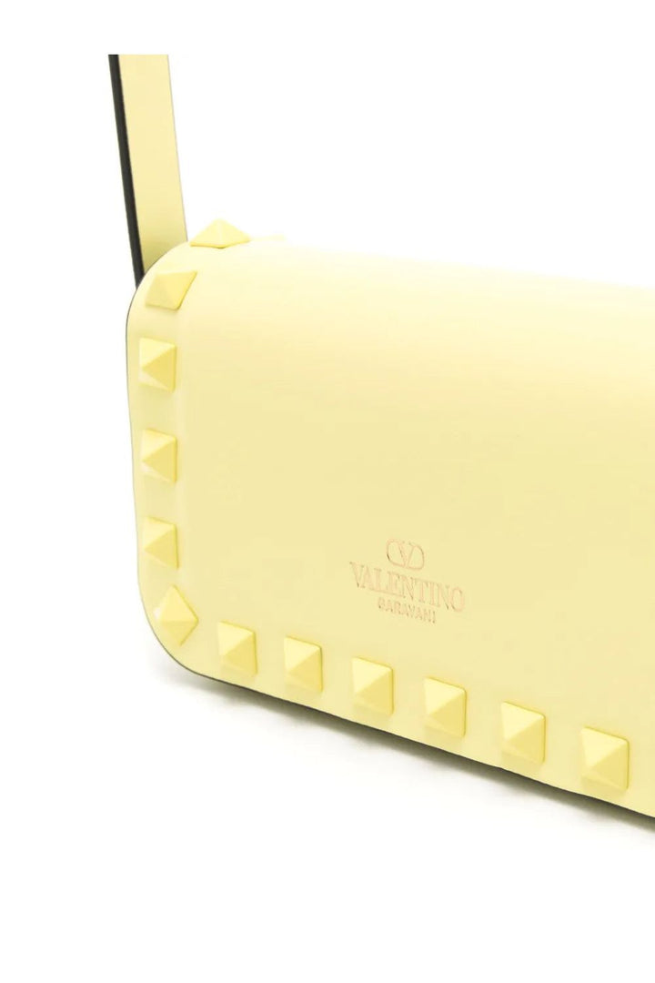 light yellow calf leather tonal stitching gold tone hardware signature Rockstud embellishment logo stamp to the rear foldover top flip lock fastening adjustable shoulder strap main compartment