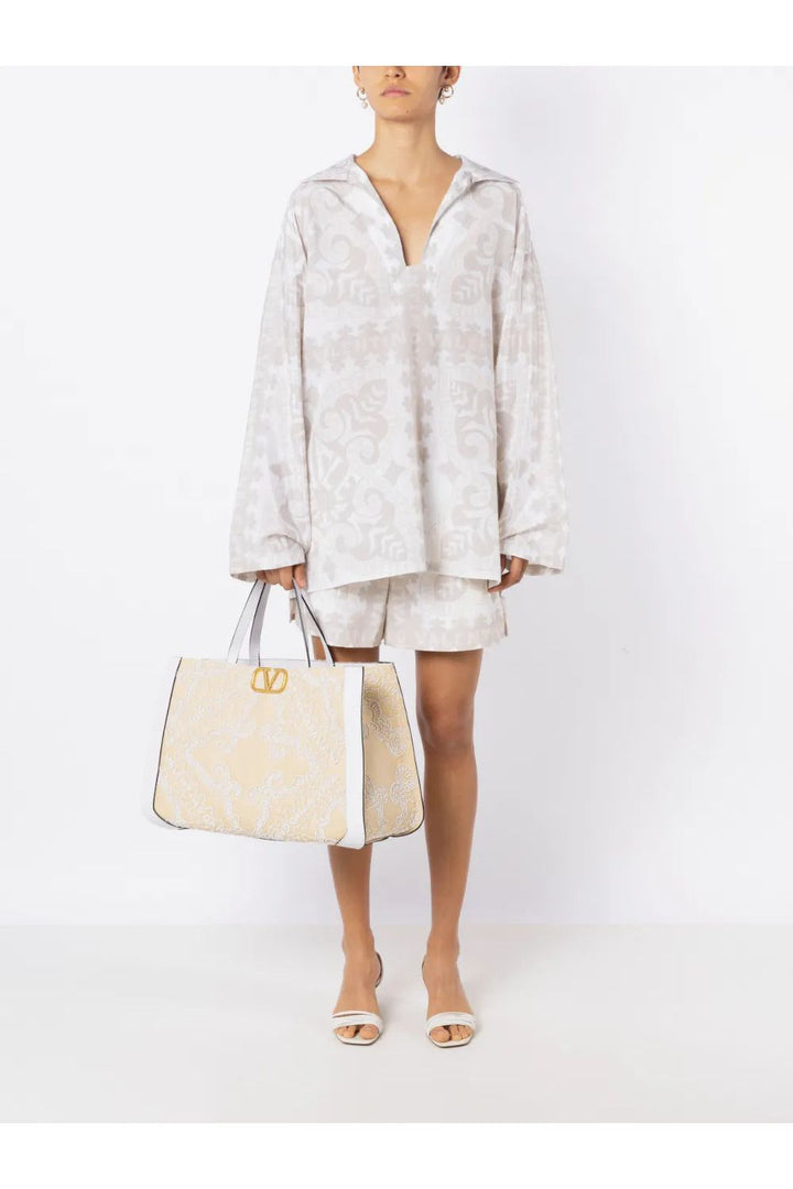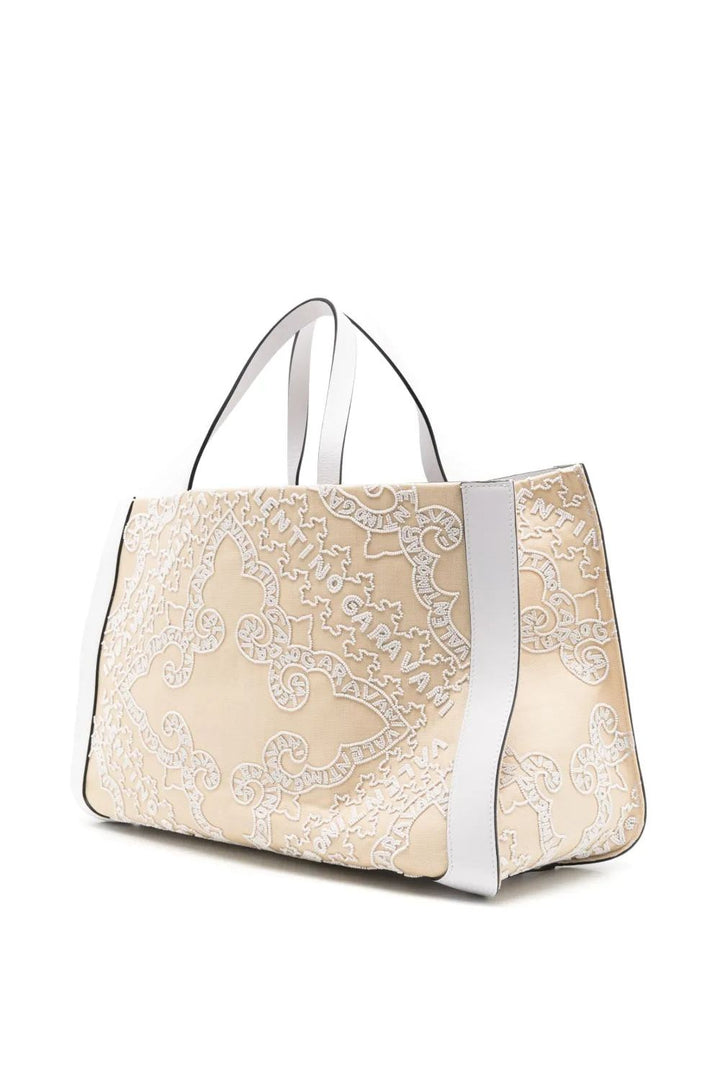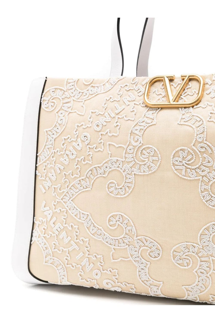 beige/white calf leather/raffia embroidered design signature V logo plaque open top two flat top handles main compartment internal slip pocket internal logo patch